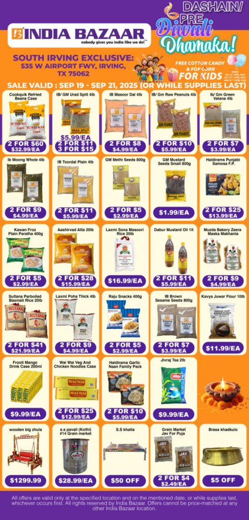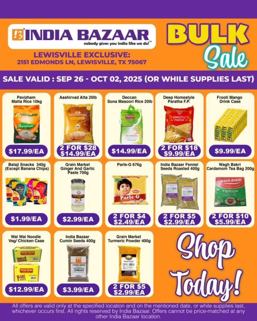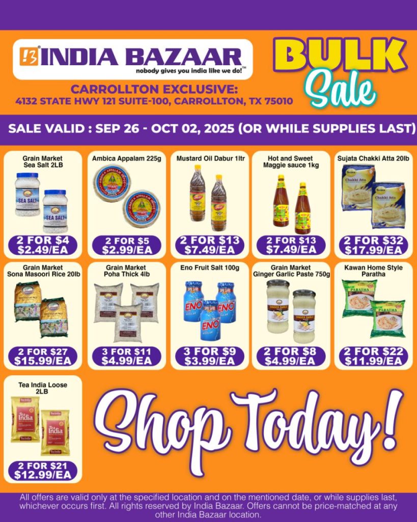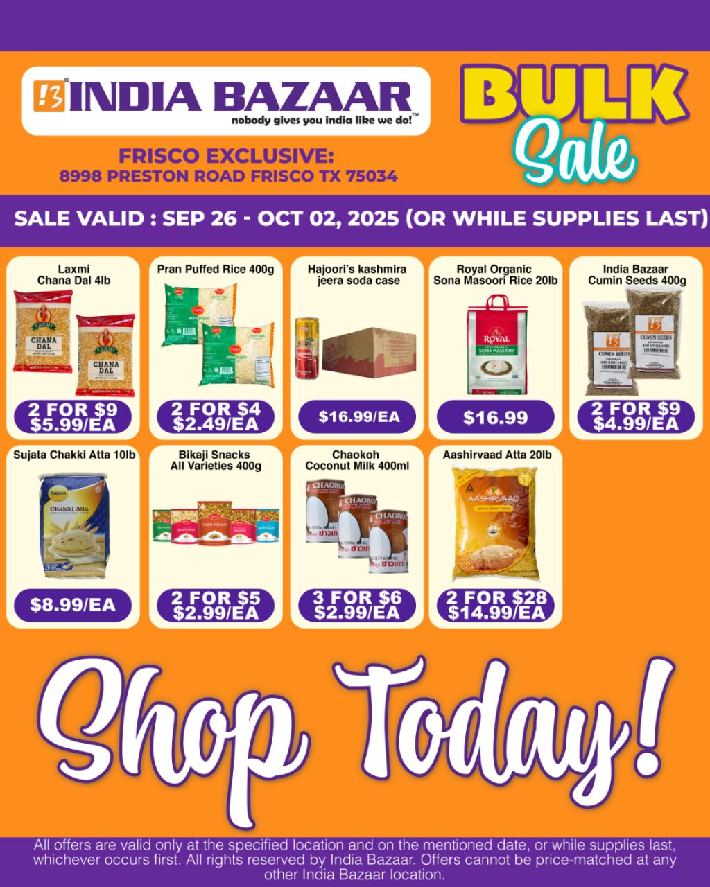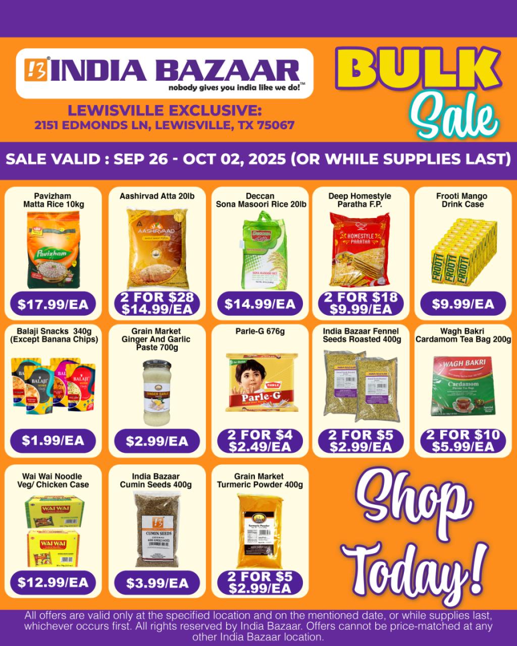 Exclusive BULK Specials! The exclusive sales and specials listed below are valid only at the specific store location mentioned on the flyer. These prices are unique to each store and cannot be price-matched at any other India Bazaar location.